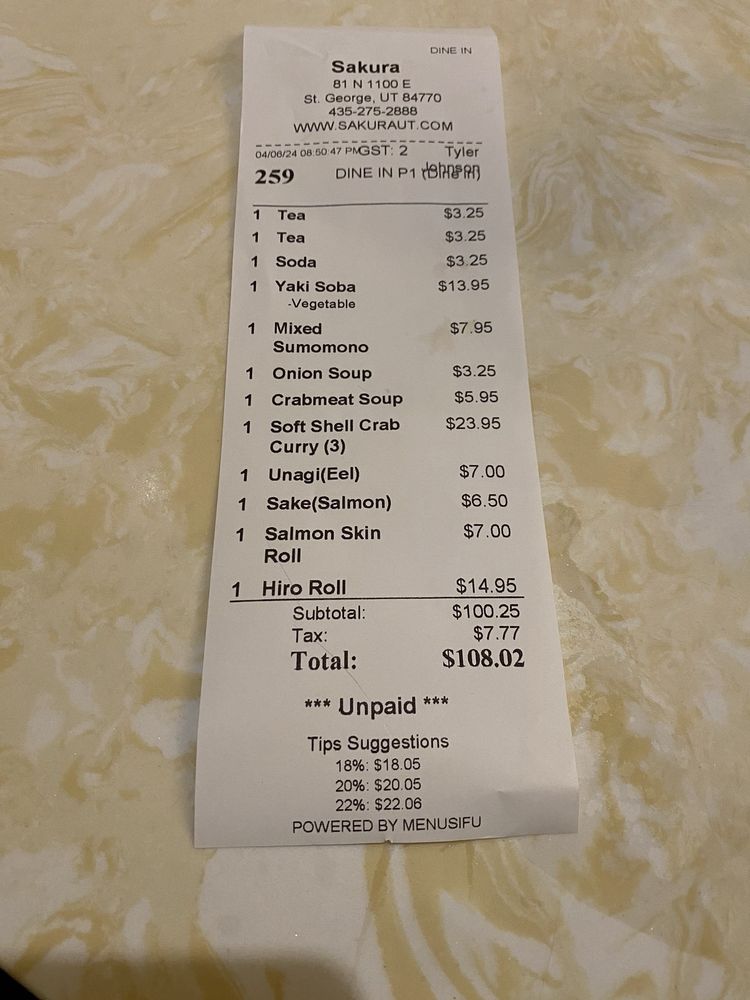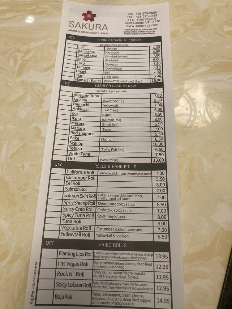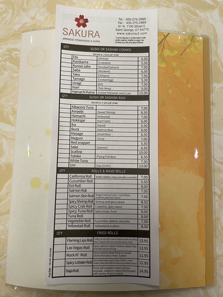 Located in the heart of St. George, UT, Sakura offers a diverse menu with a variety of options to cater to all preferences. From appetizers like Shito Saki and Shrimp Tempura to hand rolls like Spicy Tuna and Eel, each dish is crafted with precision and care. The Nigiri selection includes Eel and Yellowtail, showcasing the freshness and quality of the ingredients. Customers rave about the impeccable service and entertaining chefs, adding to the overall dining experience. The ambiance is a perfect blend of traditional and modern elements, making Sakura a standout destination for both locals and visitors. Whether you're craving a casual lunch or a special dinner with family and friends, Sakura's welcoming atmosphere and delectable dishes will leave you coming back for more.